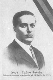 Κάλβο Σοτέλο (1893 – 1936) Αρχηγός του Εθνικού μετώπου που εκπροσωπούσε όλες τις εθνικές δυνάμεις στην Ισπανική Βουλή που είχε προκύψει από τις εκλογές του 1936. Μαχητικό στοιχείο, που τόλμησε να ασκήσει μέσα στη βουλή δριμύτατη κριτική κατά των κυβερνητικών του λαϊκού μετώπου. Τότε η γνωστή κομουνίστρια Πασιονάρια του απηύθυνε ευθέως την απειλή ότι κινδυνεύει η ζωή του. Η συνέχεια είναι γνωστή και σύμφωνη με τα μαρξιστικά πρότυπα. Τον πήραν μέσα από το σπίτι του και στη συνέχεια τον δολοφόνησαν. Ήταν τότε 41 ετών. |