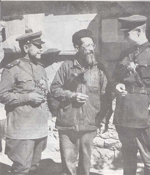| Ο συνταγματάρχης Η. Παπασταματιάδης, επιτελάρχης του γενικού στρατηγείου του ΕΛΑΣ, ανάμεσα σε δύο μελη της στρατιωτικής Σοβιετικής αποστολής. Δεξιά είναι ο συνταγματάρχης Ποπώφ και αριστερά ο βοηθός του ταγματάρχης Τσερνίντεφ. Ο σοβιετικός στρατός ήταν το ίνδαλμα των κομμουνιστών της εποχής, οι οποίοι περίμεναν από αυτόν να εδραιώσει το καθεστώς που που θα εγκαθιστούσαν. Αλλά ο Ποπώφ τους απογοήτευσε δραματικά; Με έμμεσους τρόπους (μορφασμούς κλπ.) αλλά εν τούτοις πολύ καθαρά τους είπε αυτό που γεωπολιτικά είχε προαποφασιστεί: «Ανήκετε εις την Δύση». |