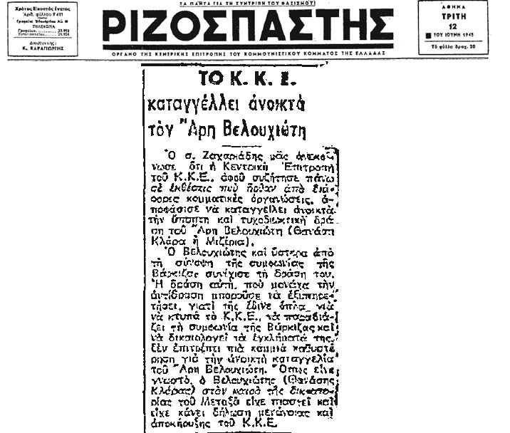 «O αρχηγός του ΚΚΕ συναγ. Νίκος Ζαχαριάδης ανακοίνωσε ότι η Κεντρική Επιτροπή του ΚΚΕ αποφάσισε να καταγγείλει δημόσια ως ύποπτη και τυχοδιωκτική τη δράση του Άρη Βελουχιώτη (Θανάση Κλάρα). Η σημερινή δράση του Άρη Βελουχιώτη εξυπηρετεί την αντίδραση στην οποία δίνει όπλα για να δυσφημιστεί το ΚΚΕ, να έχει ευτελές πρόσχημα για την παραβίαση του συμφώνου της Βάρκιζας και για τα εγκλήματα που διαπράττει εναντίον του δημοκρατικού κόσμου. Κατόπιν τούτου το ΚΚΕ καταγγέλλει ανοικτά τον Άρη Βελουχιώτη» («Ελεύθερη Ελλάδα» 12-6-45).